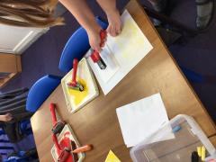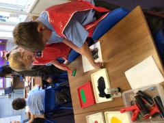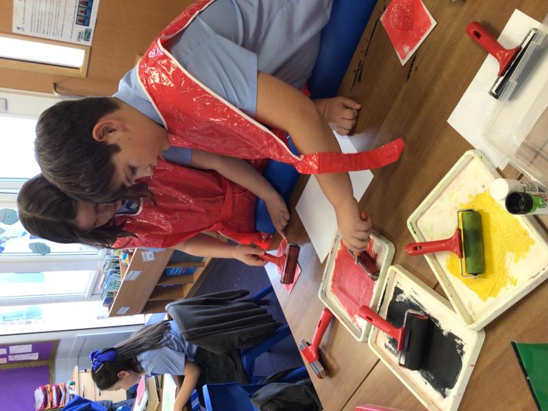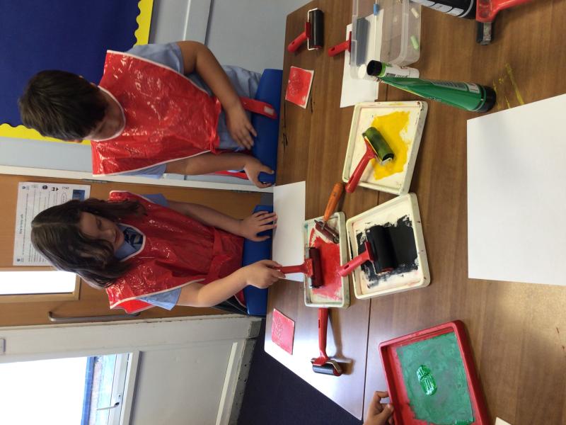 Year 4 sketched different kinds of leaves and then decided on one leaf to turn into a printing tile. We then used different colours of printing ink to use with our tiles to print our leaves.