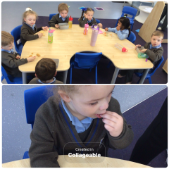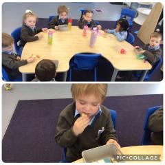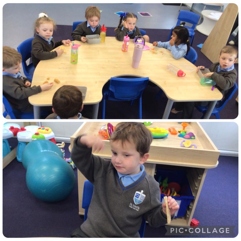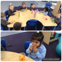 The children are definitely becoming more familiar with objects of reference, walking independently towards the hall door at lunchtime and sitting down at the table at snack time! You will see from the photos the children all sit for snack and remain seated for the entire snack time! This is very good! We are very proud of them!