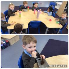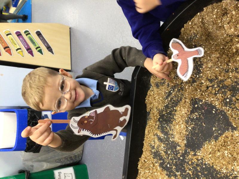 In shared reading, we enjoyed The Gruffalo. The children can now retell the story in their own words and had great fun using stick puppets for some sensory play. They also got creative and made their very own Gruffalo characters.