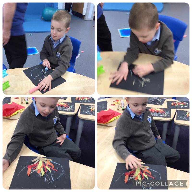 We have been very creative, making our own bonfire pictures using chalk and tissue paper to create bright, fiery effects. The children also practised their fine motor skills with firework-themed activities and worked hard on their cutting skills to make beautiful fireworks.