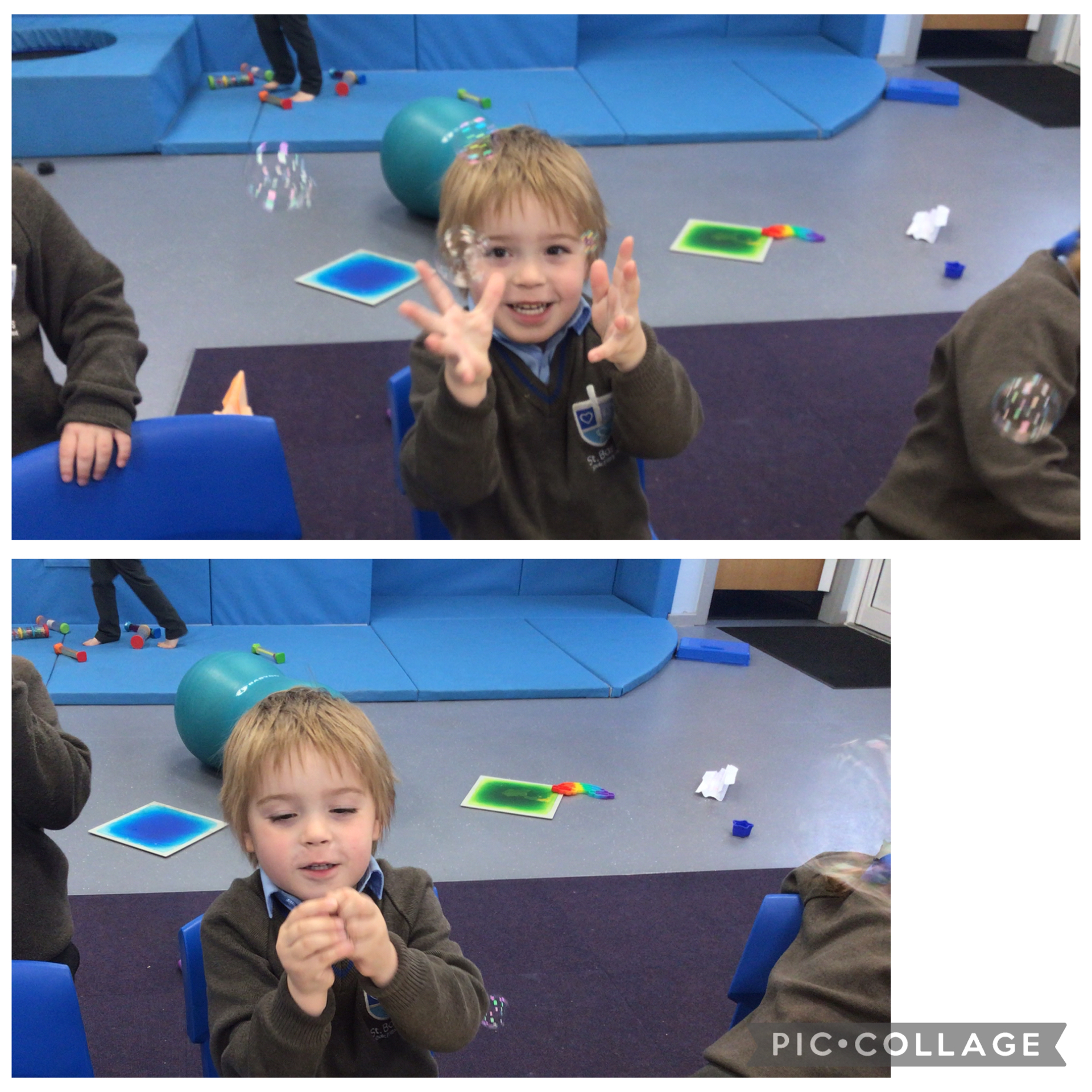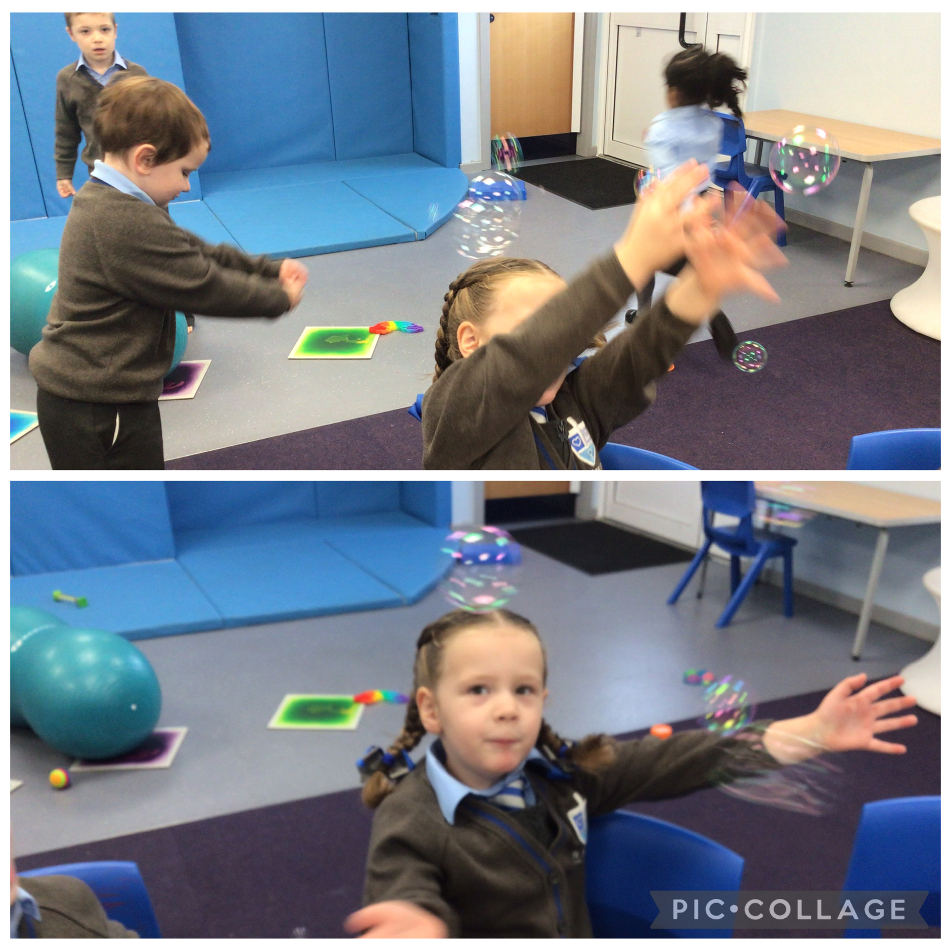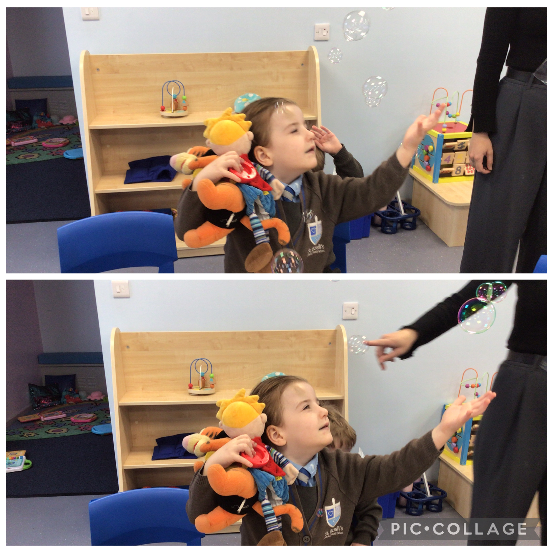 This week we introduced bubbles into our bucket session, all the children enjoyed these very much and showed sustained looking and listening. We used key words such as “more” and “finished”.